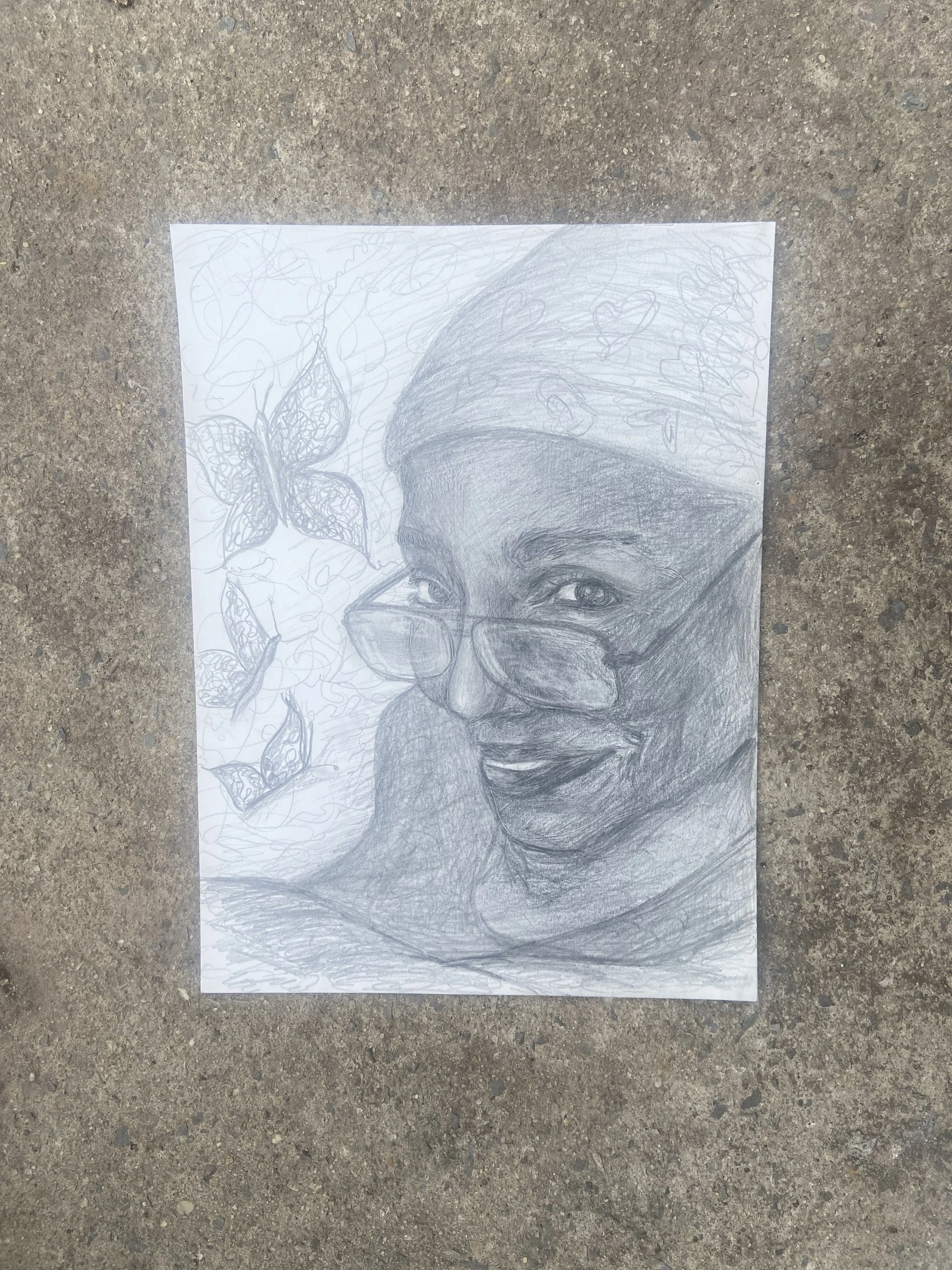 Say hello to the lovely Shelley, who commissioned a remembrance portrait of her beautiful mom, Katrina. To work on this pencil drawing, Shelley sent me a photo of her mom and asked me to incorporate butterflies coming toward her. During our first consultation, I made a rough sketch so we could agree upon the composition of the portrait. We also discussed materials such as what size paper I’d use, and the medium (in this case, pencil drawing). As I worked on this portrait, I put a special focus on capturing the love that comes through the sparkle in Katrina’s eyes.
